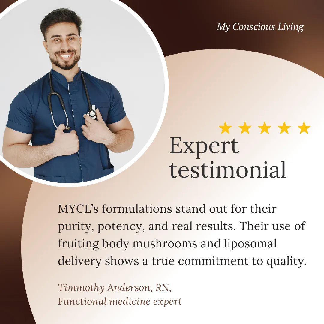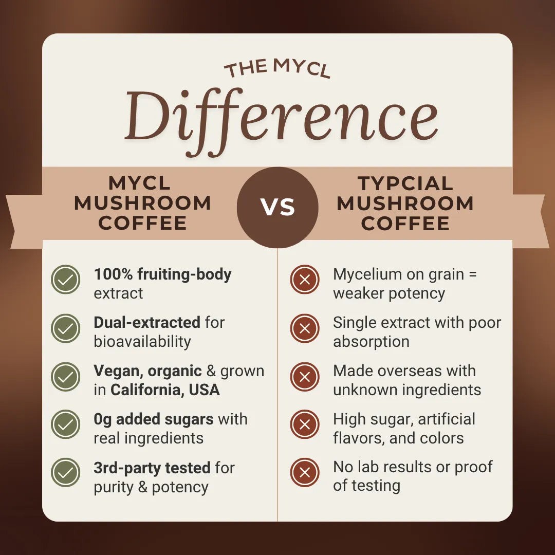 The functional mushrooms in MYCL’s blend—Lion’s Mane, Reishi, Cordyceps, and Chaga—are carefully selected for their ability to support mental clarity, stress resilience, energy, and immune function.